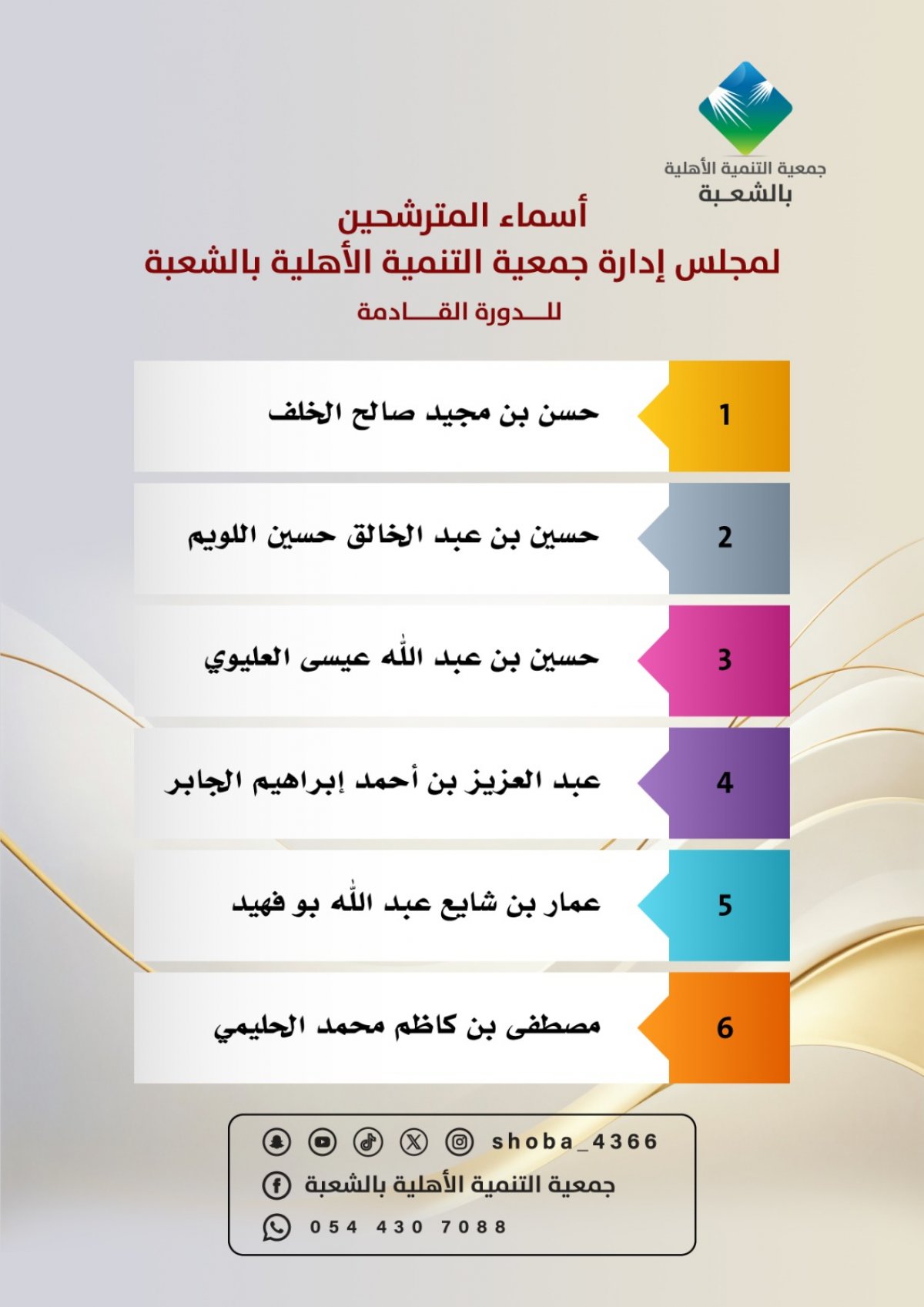 أسماء المترشحين لمجلس الإدارة بجمعية التنمية الأهلية بشعبة للدورة القادمة